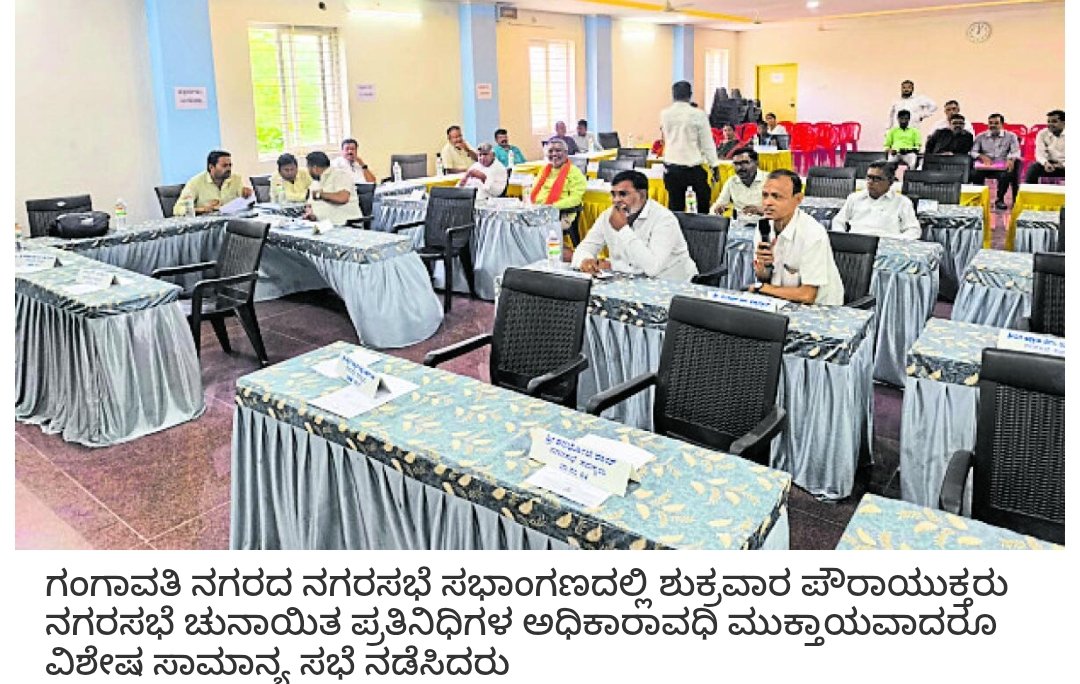 ಗಂಗಾವತಿ ನಗರದ ನಗರಸಭೆ ಸಭಾಂಗಣದಲ್ಲಿ ಶುಕ್ರವಾರ ಪೌರಾಯುಕ್ತರು ನಗರಸಭೆ ಚುನಾಯಿತ ಪ್ರತಿನಿಧಿಗಳ ಅಧಿಕಾರಾವಧಿ ಮುಕ್ತಾಯವಾದರೂ ವಿಶೇಷ ಸಾಮಾನ್ಯ ಸಭೆ ನಡೆಸಿದರು