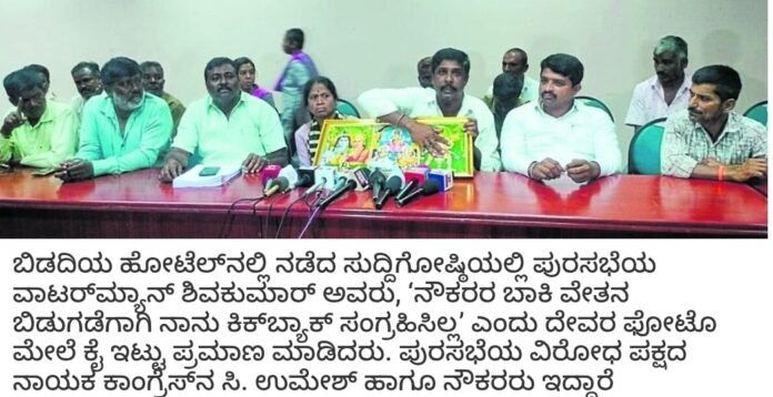 ಬಿಡದಿ (ರಾಮನಗರ): ‘ವಾಟರ್‌ಮ್ಯಾನ್‌ಗಳ ₹1.65 ಕೋಟಿ ಬಾಕಿ ವೇತನ ಬಿಡುಗಡೆ ವಿಷಯಕ್ಕೂ ನನಗೂ ಸಂಬಂಧವಿಲ್ಲ. ಪುರಸಭೆ ಅಧಿಕಾರವಿರುವುದು ಜೆಡಿಎಸ್‌ ಕೈಯಲ್ಲಿದ್ದು, ಹಣ ಬಿಡುಗಡೆಗೆ ಸ್ವತಃ ಅಧ್ಯಕ್ಷರೇ ಸಹಿ ಮಾಡಿದ್ದಾರೆ. ಜನಪರವಾಗಿ ಕೆಲಸ ಮಾಡುತ್ತಿರುವ ನನ್ನ ರಾಜಕೀಯ ಏಳಿಗೆ ಸಹಿಸದೆ ಕಿಕ್‌ಬ್ಯಾಕ್ ಪಡೆದಿದ್ದೇನೆ ಎಂದು ಸುಳ್ಳು ಆರೋಪ ಮಾಡುತ್ತಿದ್ದಾರೆ’ ಎಂದು ಇಲ್ಲಿನ ಪುರಸಭೆಯ ವಿರೋಧ ಪಕ್ಷದ ನಾಯಕ ಕಾಂಗ್ರೆಸ್‌ನ ಸಿ. ಉಮೇಶ್ ತಿರುಗೇಟು