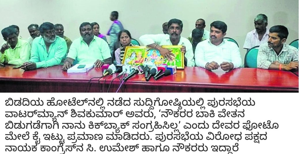 ‘ಒಂಬತ್ತು ವರ್ಷಗಳಿಂದ ಕಾರ್ಮಿಕ ಕೋರ್ಟ್‌ ಮತ್ತು ಸಂಬಂಧಪಟ್ಟ ಇಲಾಖೆಗಳಿಗೆ ನಾನು ಅಲೆದಿದ್ದರಿಂದ ನೌಕರರ ಬಾಕಿ ವೇತನ ಬಿಡುಗಡೆಯಾಗಿದೆ. ಅದಕ್ಕಾಗಿ ಸುಮಾರು ₹9 ಲಕ್ಷ ಖರ್ಚಾಗಿದ್ದು, ಹಲವರಿಗೆ ಹಣ ಕೊಟ್ಟಿದ್ದೇನೆ. ಅವರ ಹೆಸರನ್ನು ನಾನಿಲ್ಲಿ ಹೇಳಲಾಗದು. ನನ್ನ ಶ್ರಮಕ್ಕಾಗಿ ನೌಕರರೇ ಮಾತನಾಡಿಕೊಂಡು ನನಗೆ ಹಣ ಕೊಡಲು ಮುಂದಾಗಿದ್ದಾರೆ. ಆದರೆ, ವೇತನ ಬಿಡುಗಡೆ ಮಾಡಿದ್ದಕ್ಕೆ ಪ್ರತಿಯಾಗಿ ಪ್ರತಿ ನೌಕರರ ಬಾಕಿ ವೇತನದಲ್ಲಿ ಶೇ 15ರಷ್ಟು ಕಮಿಷನ್‌ ಸಂಗ್ರಹಿಸಿದ್ದೇನೆ ಎಂಬುದು ಸುಳ್ಳು’ ಎಂದು ವಾಟರ್‌ಮ್ಯಾನ್ ಶಿವಕುಮಾರ್ (ಮಾಯಣ್ಣ) ದೇವರ ಫೋಟೊ ಮೇಲೆ ಕೈ ಇಟ್ಟು ಪ್ರಮಾಣ ಮಾಡಿದರು.