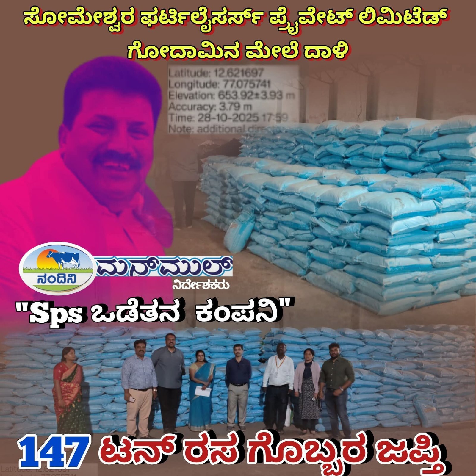 ಮದ್ದೂರು: ತಾಲ್ಲೂಕಿನ ಸೋಮನಹಳ್ಳಿ ಸಮೀಪದ ಸೋಮೇಶ್ವರ  ಫರ್ಟಿಲೈಸರ್ಸ್ ಪ್ರೈವೇಟ್ ಲಿಮಿಟೆಡ್, ಸೋಮೇಶ್ವರ ಟ್ರೇಡಿಂಗ್ ಕಾಪೋರೇಷನ್ ಸಂಸ್ಥೆಯ ರಸಗೊಬ್ಬರ ಮಿಶ್ರಣ ತಯಾರಿಕ ಘಟಕದ ಮೇಲೆ ಕೃಷಿ ಇಲಾಖೆಯ ಅಧಿಕಾರಿಗಳು ದಾಳಿ ನಡೆಸಿ ಗೋದಾಮಿನಲ್ಲಿದ್ದ 147 ಟನ್ ರಸಗೊಬ್ಬರವನ್ನು ಜಪ್ತಿ ಮಾಡಿದ್ದಾರೆ. ಅಲ್ಲದೇ ಐಪಿಎಲ್ ಸಂಸ್ಥೆಯ ರಸಗೊಬ್ಬರದ ಲೇಬಲ್ ಇರುವ 64,750 ಹೊಸ ಖಾಲಿ ಚೀಲಗಳನ್ನು ವಶಪಡಿಸಿಕೊಂಡಿದ್ದಾರೆ. ರಸಗೊಬ್ಬರ (ನಿರವಯವ, ಸಾವಯವ, ಹಾಗೂ ಮಿಶ್ರಿತ) ನಿಯಂತ್ರಣ ಆದೇಶ 1985 ಹಾಗೂ ನಿಯಮ ಉಲ್ಲಂಘನೆ ಮಾಡಿದ್ದಕ್ಕಾಗಿ ಈ ಸಾಮಗ್ರಿಗಳನ್ನು ಜಪ್ತಿ ಮಾಡಿ ಮುಂದಿನ ಕಾನೂನು ಕ್ರಮ ಕೈಗೊಳ್ಳಲಾಗಿದೆ.