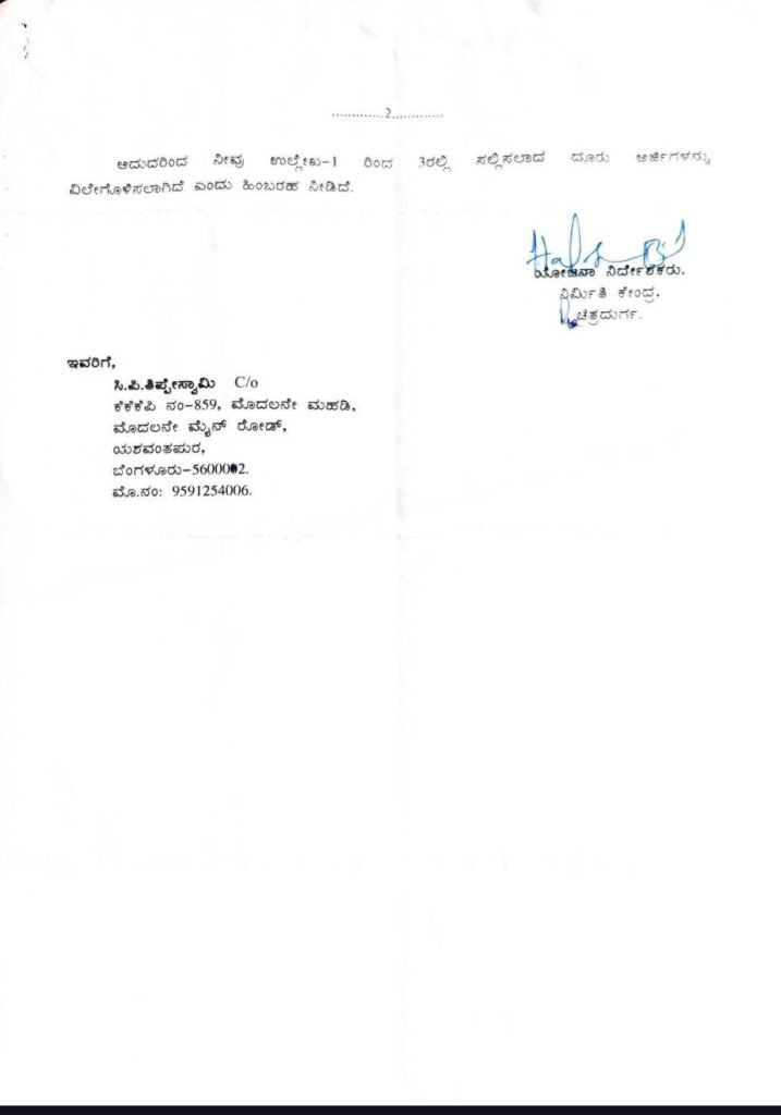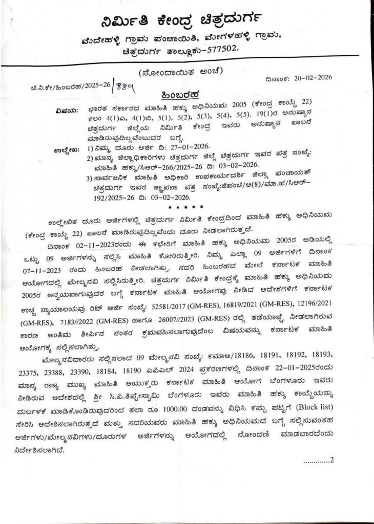 ಬೆಂಗಳೂರಿನ ಯಶವಂತಪುರದ ನಿವಾಸಿ ಸಿ.ಪಿ. ತಿಪ್ಪೇಸ್ವಾಮಿ ಎಂಬುವರು ಚಿತ್ರದುರ್ಗ ನಿರ್ಮಿತಿ ಕೇಂದ್ರದ ಕಾಮಗಾರಿಗಳ ಅನುಷ್ಠಾನದ ಬಗ್ಗೆ 02-11-2023 ರಂದು ಒಟ್ಟು 09 ಆರ್ಟಿಐ ಅರ್ಜಿಗಳನ್ನು ಸಲ್ಲಿಸಿದ್ದರು. ಈ ಅರ್ಜಿಗಳನ್ನು ಮುಕ್ತಾಯಗೊಳಿಸಿ ದಿನಾಂಕ 20-02-2026 ರಂದು ಯೋಜನಾ ನಿರ್ದೇಶಕ ಹರೀಶ್ ಕುಮಾರ್ ಬಿ.ಎಸ್. ಹಿಂಬರಹ ನೀಡಿದ್ದಾರೆ.