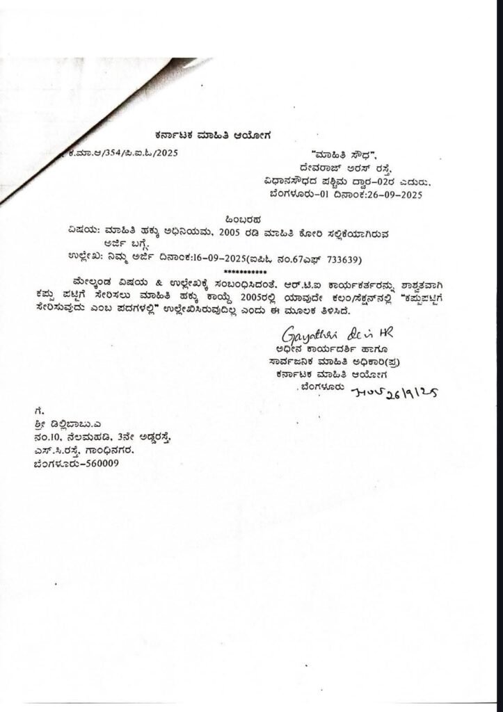 ಯೋಜನಾ ನಿರ್ದೇಶಕ ಹರೀಶ್ ಕುಮಾರ್ ಈ ನಡೆಯ ಸಂಪೂರ್ಣ ಬಣ್ಣವನ್ನು ‘ಕರ್ನಾಟಕ ಮಾಹಿತಿ ಆಯೋಗ’ದ ಅಧಿಕೃತ ಹಿಂಬರಹಗಳೇ ಬಯಲು ಮಾಡಿವೆ. ಆಯೋಗದ ಹಿಂಬರಹ ದಿನಾಂಕ 26-09-2025 1ರಲ್ಲಿ ಡಿಲ್ಲಿಬಾಬು.ಎ ಅವರಿಗೆ ಮಾಹಿತಿ ಆಯೋಗ ನೀಡಿರುವ ಹಿಂಬರಹದಲ್ಲಿ, “ಆರ್.ಟಿ.ಐ ಕಾರ್ಯಕರ್ತರನ್ನು ಶಾಶ್ವತವಾಗಿ ಕಪ್ಪು ಪಟ್ಟಿಗೆ ಸೇರಿಸಲು ಮಾಹಿತಿ ಹಕ್ಕು ಕಾಯಿದೆ 2005ರಲ್ಲಿ ಯಾವುದೇ ಕಲಂ/ಸೆಕ್ಷನ್ನಲ್ಲಿ ಅವಕಾಶವಿಲ್ಲ” ಎಂದು ಸ್ಪಷ್ಟವಾಗಿ ತಿಳಿಸಿದೆ.