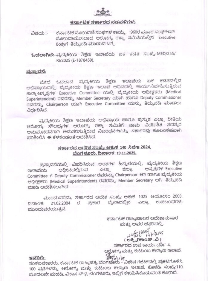 ಮೆಡಿಕಲ್ ಕಾಲೇಜು ವ್ಯಾಪ್ತಿಯಲ್ಲಿನ ಆಸ್ಪತ್ರೆಗಳ ಆರೋಗ್ಯ ರಕ್ಷಾ ಸಮಿತಿಗೆ ಜಿಲ್ಲಾಧಿಕಾರಿಗಳನ್ನು ಅಧ್ಯಕ್ಷರನ್ನಾಗಿಸಿ ಮೆಡಿಕಲ್ ಸೂಪರಿಂಟೆಂಡೆಂಟ್ ಗಳನ್ನು ಸದಸ್ಯ ಕಾರ್ಯದರ್ಶಿಯಾಗಿಸಿ ಆರೋಗ್ಯ ಇಲಾಖೆ ಆದೇಶ ಹೊರಡಿಸಿದೆ.