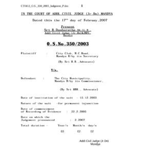 ನಗರಸಭೆಗೆ ಹೊಂದಿಕೊಂಡಂತೆ ಇರುವ ಸ್ಥಳದಲ್ಲಿ ಸಿಟಿಕ್ಲಬ್ ಹೊಸ ಕಟ್ಟಡ ನಿರ್ಮಾಣಕ್ಕೆ ಮುಂದಾದಾಗ ಸಿಟಿ ಕ್ಲಬ್ ತನ್ನದಲ್ಲದ ಭೂಮಿಯಲ್ಲಿ ನಡೆಯುತ್ತಿದ್ದು ಸದರಿ ಭೂಮಿಯನ್ನು ನಗರಸಭೆ ವಶಕ್ಕೆ ಪಡೆಯಲು ೨೦೦೩ ರಲ್ಲೆ ಮಂಡ್ಯದ ಸಿವಿಲ್ ನ್ಯಾಯಾಲಯದಲ್ಲಿ ಮಂಡ್ಯ ನಗರಸಭೆ ದಾವೆ ಹಾಕಿತ್ತು.ಈ ಪ್ರಕರಣದ ವಿಚಾರಣೆ ನಡೆದು ನಗರಸಭೆಗೆ ಹೊಂದಿಕೊಂಡಂತಿರುವ ಹೊಸ ಕಟ್ಟಡ ಅಕ್ರಮವಾಗಿದ್ದು ಸದರಿ ಭೂಮಿಯನ್ನು ವಶಕ್ಕೆ ಪಡೆಯುವಂತೆ ನ್ಯಾಯಾಲಯ ಆದೇಶ ಮಾಡಿತ್ತು.
