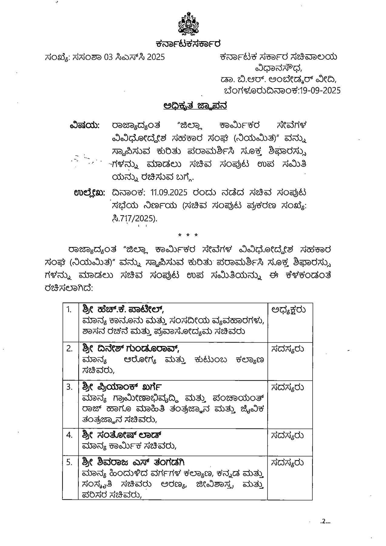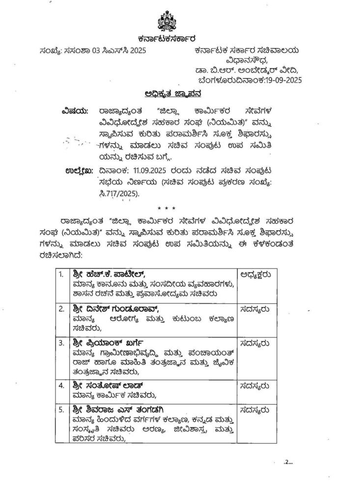 ಬೆಂಗಳೂರು: ಸೆ.೧೯.ರಾಜ್ಯದ ವಿವಿಧ ಇಲಾಖೆಗಳಲ್ಲಿ ಹೊರಗುತ್ತಿಗೆ ಆಧಾರದಲ್ಲಿ ಕರ್ತವ್ಯ ನಿರ್ವಹಿಸುತ್ತಿರುವ ನೌಕರರ ಸಹಕಾರಿ ಸೊಸೈಟಿ ರಚಿಸುವ ಸಂಬಂದ ಸಾಧಕ ಬಾಧಕಗಳ ಅಧ್ಯಯನಕ್ಕಾಗಿ ಸರಕಾರ ಸಂಪುಟ ಸಮಿತಿ ರಚಿಸಿ ಆದೇಶ ಹೊರಡಿಸಿದೆ.ಸಮಿತಿಯಲ್ಲಿ ಸಚಿವರಾದ ಸಂತೋಷ್ ಲಾಡ್ ಪ್ರಿಯಾಂಕ್ ಖರ್ಗೆ ಭೈರತಿ ಸುರೇಶ್.ಎಚ್ ಕೆ ಪಾಟೀಲ ದಿನೇಶ್ ಗುಂಡುರಾವ್ ರನ್ನು ಸದಸ್ಯರನ್ನಾಗಿ ನೇಮಿಸಲಾಗಿದೆ.ಸದರಿ ಸಮಿತಿಯು ಹೊರಗುತ್ತಿಗೆ ನೌಕರರ ಸಹಕಾರಿ ಸೊಸೈಟಿ ರಚನೆಯ ಸಾಧಕ ಭಾಧಕಗಳ ಅಧ್ಯಯನ ನಡೆಸಿ ವರದಿ ನೀಡಲಿದೆ.