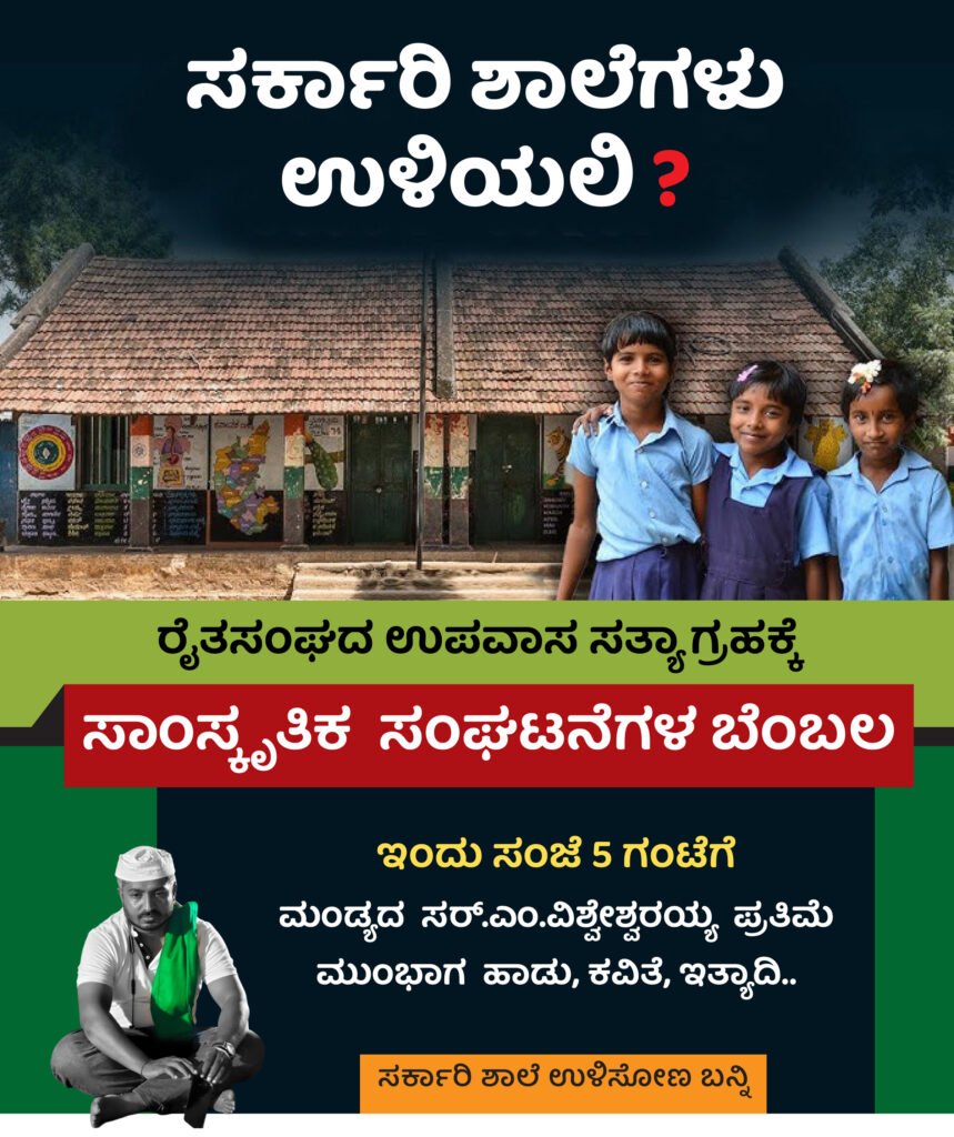ರೈತಸಂಘದ ಸರ್ಕಾರಿ ಶಾಲೆ ಉಳಿಸಿ ಉಪವಾಸ ಸತ್ಯಾಗ್ರಹ ಬೆಂಬಲಿಸಿ ಮಂಡ್ಯ ಹತ್ತಾರು ಸಂಘ ಸಂಸ್ಥೆಗಳು ಇಂದು ಸಂಜೆ ಧರಣಿ ಸ್ಥಳದಲ್ಲಿ ಹಾಡು, ಕವಿತೆ ಮತ್ತು ಚಿತ್ರಕಲೆಯ ಮೂಲಕ ಸಾಂಸ್ಕೃತಿಕ ಪ್ರತಿರೋಧಕ್ಕೆ ಮುಂದಾಗಿವೆ. “ನಾವು ಓದಿದ ಶಾಲೆಗಳು ನಮ್ಮ ಕಣ್ಣೆದುರೇ ಮುಚ್ಚುತ್ತಿರುವಾಗ ನಾವು ಮೌನವಾಗಿರಬಾರದು. ನಾವು ನಮ್ಮದೇ ರೀತಿಯ ಪ್ರತಿಭಟನೆಯನ್ನು ದಾಖಲಿಸುತ್ತೇವೆ. ಚಳಿ ಗಾಳಿಯೆನ್ನದೆ ಉಪವಾಸ ಕೂತಿರುವವರಿಗೆ ನಾವು ಬೆಂಬಲಿಸುತ್ತೇವೆ” ಎಂದು ಚಿತ್ರಕೂಟ ಬಳಗದ ಸದಸ್ಯರು ಪ್ರಕಟಣೆಯಲ್ಲಿ ತಿಳಿಸಿದ್ದಾರೆ.